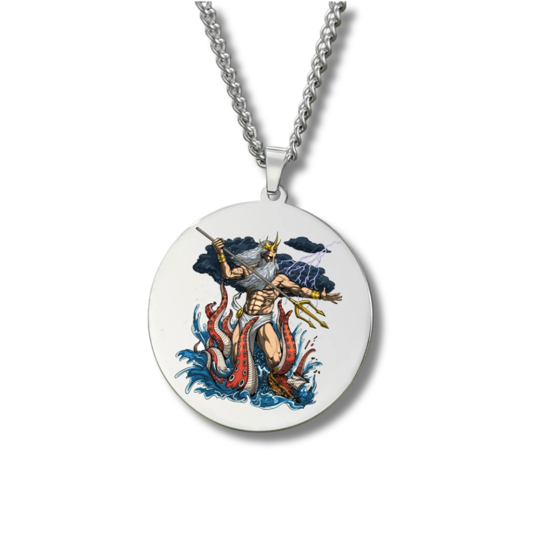- Poseidon – Steel: Silver-tone pendant with colored depiction of Poseidon commanding the waves.