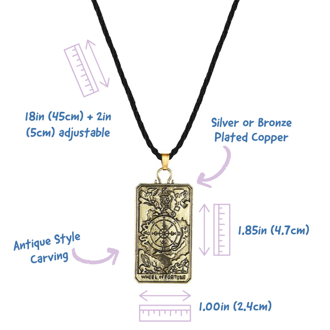 Our Wheel Of Fortune Tarot Card Necklaces has an exclusive carved design conferring an antique feel that is certain to please you or anyone you gift them.